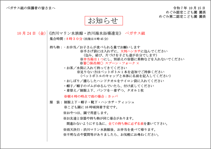 10月24日(金)に予定されている、ペガサス組の渋川マリン水族館への遠足について、以下の通りお知らせいたします。