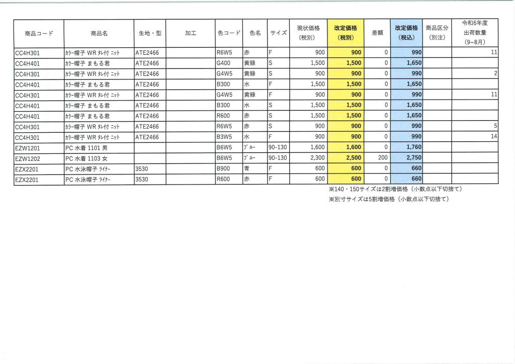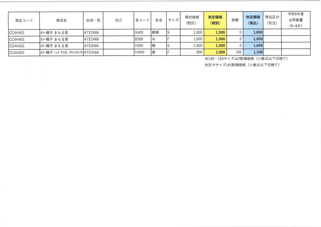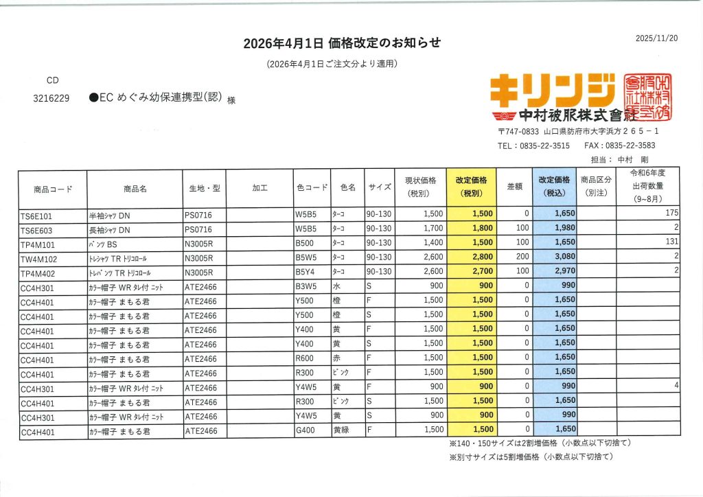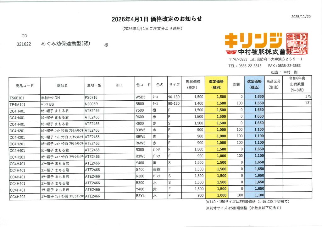 当園で採用している園児用制服とカラー帽子について、令和8年4月1日の注文分から価格の改定があります。各商品の新しい料金につきましては、以下をご確認ください。