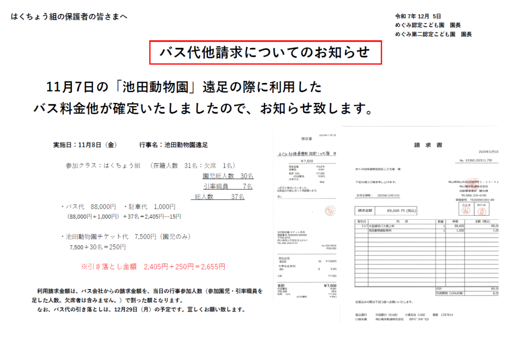【NEW】はくちょう組・池田動物園遠足料金確定のお知らせ