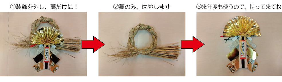 また、お家にしめ縄飾り・書初めがある方は、一緒にはやしますので、金属等の燃えない物を外してお持ち下さい。